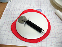 31. Cutaway the excess fondant as close as the cake meets the board and turn the cake as you do this so you can see where you're cutting